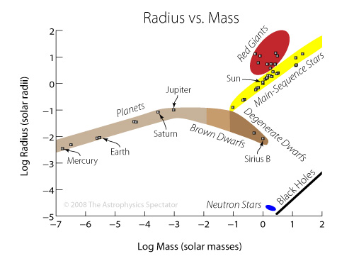 Radius versus mass of self-supporting objects. This diagram roughly shows how the sizes of various objects depend on their masses. The horizontal axis is the log base 10 of the mass in units of solar mass. The vertical axis is the log base 10 of the radius in units of solar radius. The squares mark specific objects with measured radii and masses. The planets, brown dwarfs, and degenerate (white) dwarfs lie on a continuous band extending from the smallest masses to 1.4 solar masses. The light brown region of this band encloses the planets, the medium brown region encloses the brown dwarfs, and the dark brown region encloses the degenerate dwarfs. The main-sequence stars lie in a yellow band extending from 0.072 solar masses to several hundred solar masses. The red giants are in the red region of the diagram. The neutron stars, which range in mass from about 1.4 to 2.5 solar masses, lie in the blue region at the bottom-right of the diagram, and the black holes lie along the black diagonal line at the bottom-right. The masses and radii for the two degenerate dwarfs in the plot (40 Eridani B and Sirius B) are from Shipman et al. (1997) and Provencal et al. (1998).[1,2] The masses and radii for the main-sequence stars and red giants are from Pasinetti Fracassini et al. (2001), Perevozkina and Svechnikov (1999), and Belikov (1995).[3,4,5]