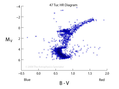 Below is the HR diagram for the globular cluster 47 Tuc (NGC 104), which is in the Tucana constellation of the Southern Hemisphere. This cluster is about 4.5 kiloparsecs from Earth. Its absolute visual magnitude is -9.6, which is of order a million times the luminosity of the Sun, with its absolute visual magnitude of 4.83. What is clear from this cluster's HR diagram is that the stars in the cluster are highly-evolved, with the stars of absolute visual magnitude less than 4 having moved far away from the main sequence. As in M 67, the stars in 47 Tuc moved off of the main sequence by moving right to the red region of the diagram. The red giant stars, with magnitudes of 1 and less, are apparent in this diagram. The shape of this HR Diagram suggests that the stars in 47 Tuc are 13 billion years old, which means they 80% of the universe's age.